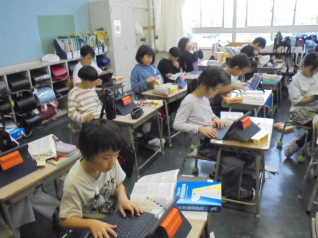 4年生は,国語で「くらしの中の和と洋」の学習をしています。範読を聞いて初発の感想を書いた後,意味の分からない言葉を国語辞典を使って調べました。「共存」「調和」など,子どもたちにとってはなじみのない言葉ですが,辞典で調べて意味を知ると,納得した様子でした。