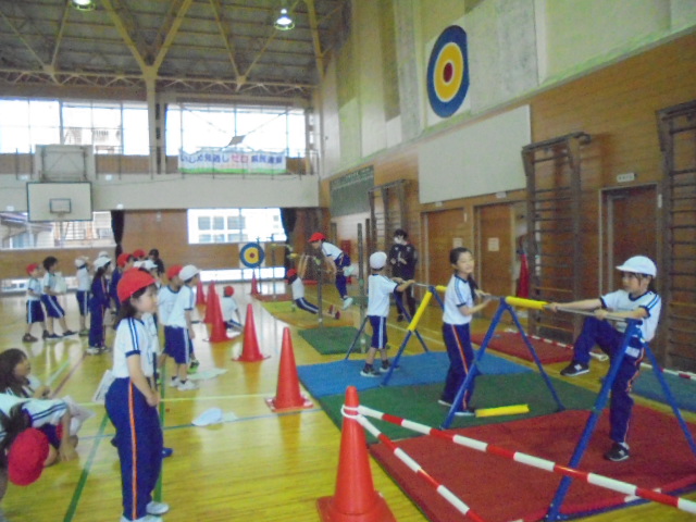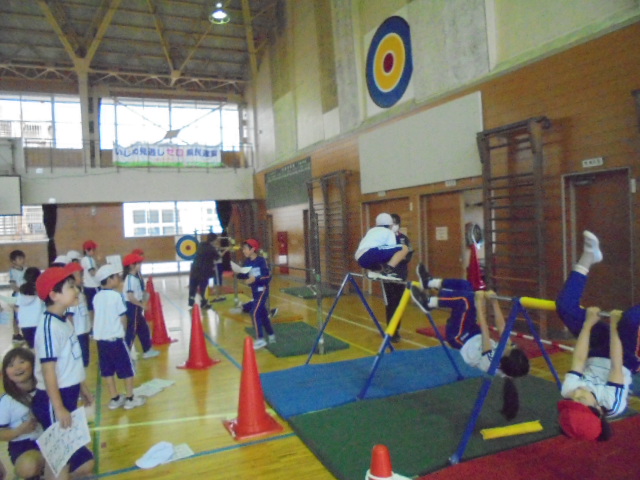 3年生は,体育で「鉄棒運動」の学習をしています。はじめに,3年生が挑戦する技が載っている鉄棒カードを見て,自分ができるようになりたい技や練習方法を考え,練習を始めました。今は初級段階で,ぶたのまるやきやこうもり,前おりなどの技を練習しています。これから練習を重ね,できる技がどんどん増えていくことを期待しています。