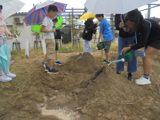5年生は,理科で「流れる水のはたらき」の学習をしました。動画や写真で川の上流から下流までの川岸の様子や流れの速さ,石の形などを観察しました。その後,実際に山の作って水を流したり,水が入った容器の中でスポンジを振ったりして働きを調べました。子どもたちは,実験を通して流れる水の働きである「浸食」「運搬」「堆積」の理解を深めました。
