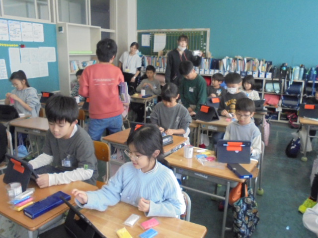 3年生は,図工で「空き容器の変身」の学習を始めました。この学習は,空き容器に紙粘土をつけて作品を作る学習です。最初に,色の付いた紙粘土を混ぜるとどんな色になるか動画を見た後,iPadに描いた作品を実際に作り始めました。子どもたちは,紙粘土を混ぜると色が変わったり,容器に紙粘土をくっつけたりして,楽しみながら作っていました。