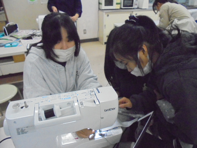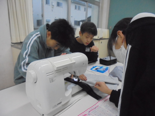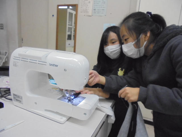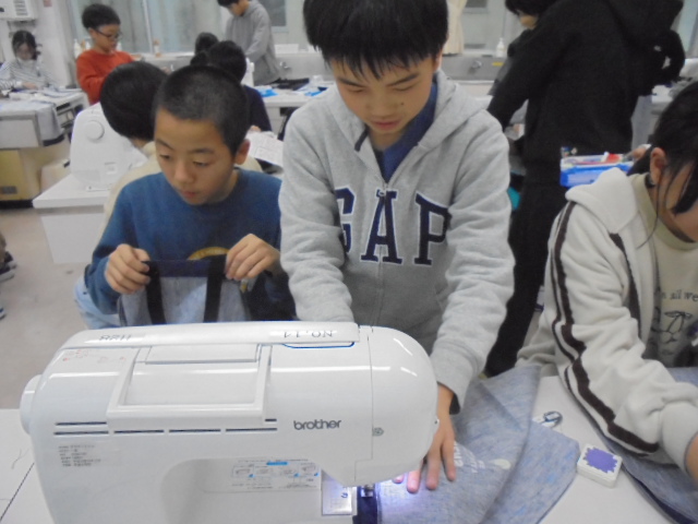 6年生は,家庭科「ソーイングで生活を豊かに」の学習で,ミシンを使ってトートバックやナップザックを作っています。ミシンの使い方を覚え,友達と協力しながら意欲的に作品を作っています。