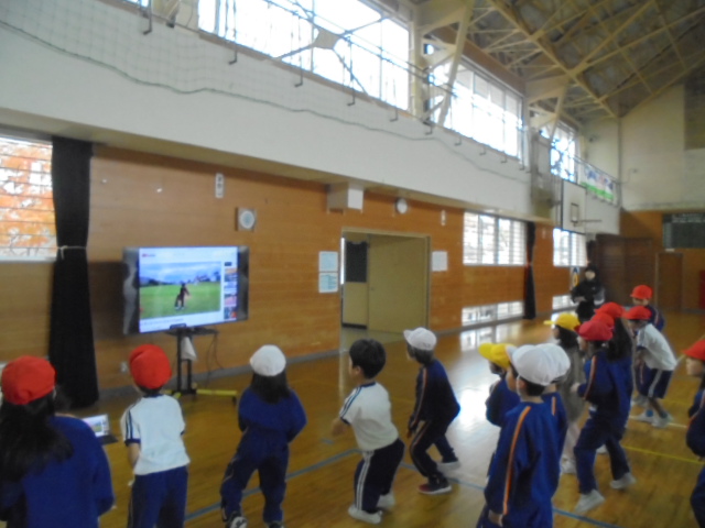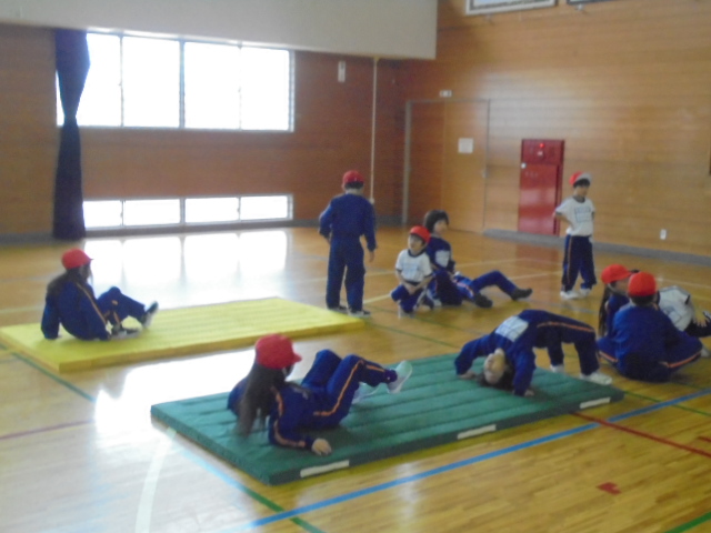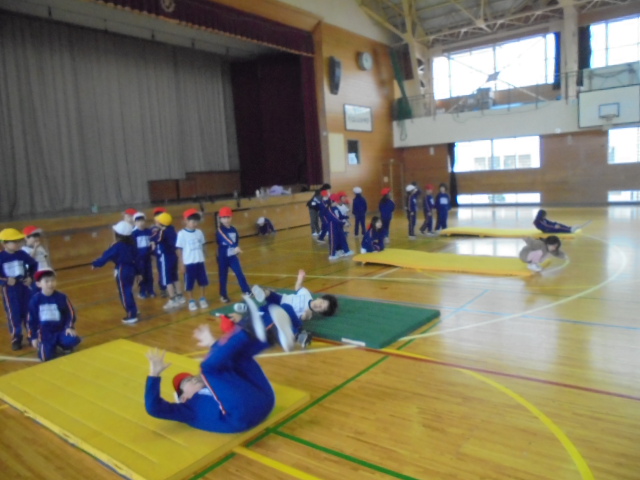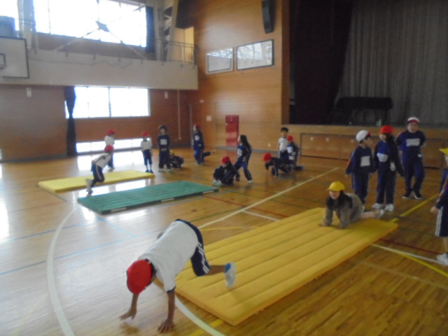 1年生は,体育で「マットを使った運動遊び」に取り組んでいます。子どもたちに人気の「ナルトダンス」で体をほぐした後,マットでいろいろな動きに挑戦しています。「熊歩き」「クモ歩き」「前転がり」「後ろ転がり」など,練習するごとにどんどん上達しています。