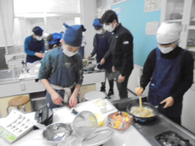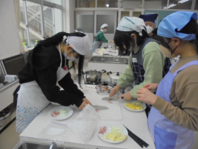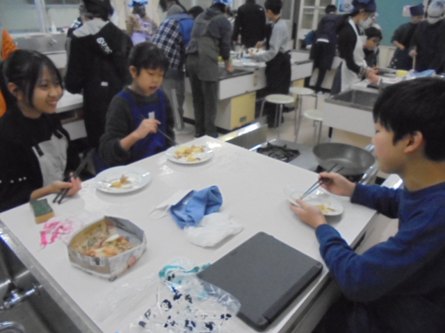 6年生は,家庭科「献立を工夫して」の調理実習でジャーマンポテトと粉ふきいもを作りました。材料のジャガイモの皮をむいて切ったり,ゆでたり炒めたりと,おいしいおかずを作ろうと取り組んでいました。少しジャガイモが硬かった班があったみたいですが,自分たちで作ったジャーマンポテトや粉ふきいもの味は格別だったようです。学校で学習したことを生かして,今度は家で作ってみようと意気込んでいました。