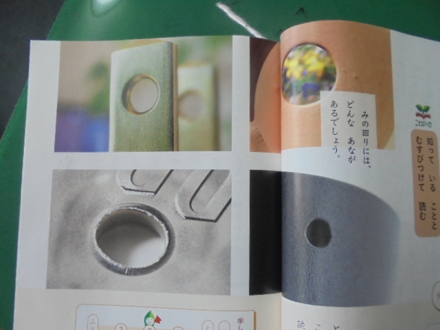 について学習しています。この日は,教科書に載っている4つの穴の写真を見て,何の穴か考えました。子どもたちは,4つの穴に興味津々。これまでの生活経験から,「50円玉」「植木鉢の穴」「家電製品の差し口」「「醤油差し」の穴をすべて当てることができました。そして,それらの穴がどのような役割をもっているのか疑問をもち始めました。これから教科書を読み進めて,穴の役割について読み取ります。