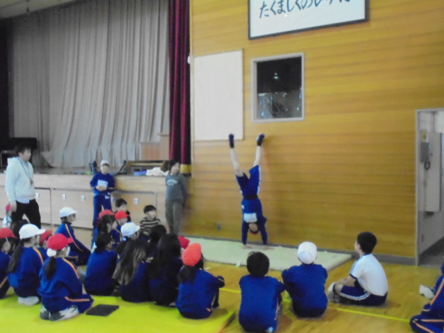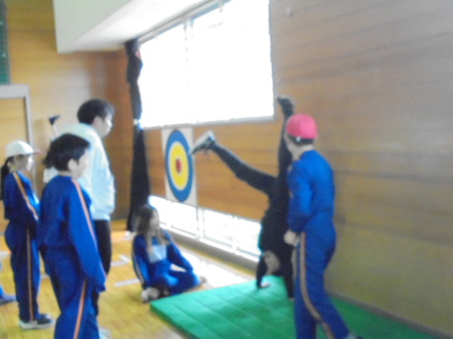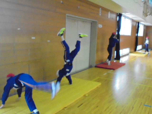 4年生は,マット運動の学習に取り組んでいます。この日は,三点倒立や倒立の練習をしました。友達と姿勢を見合ったり動画を撮影したりして,きれいに倒立ができるように練習しています。寒い中ですが,汗をかくほど一生懸命練習していました。