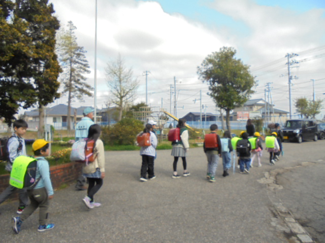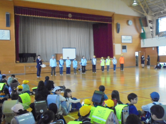 16日(木),第1回地区子ども会を行いました。子ども会では,新しい地区のメンバーや会長・副会長,通学班や危険な場所等の確認をしました。子ども会が終わってから通学班ごとに体育館に集まって,安全な登下校の仕方について話を聞きました。その後,職員・各地区民生委員も子どもたちと一緒に下校訓練を行いました。