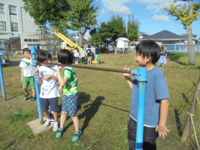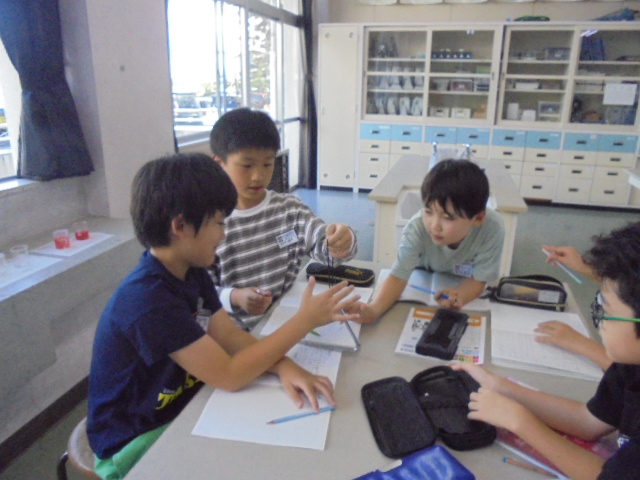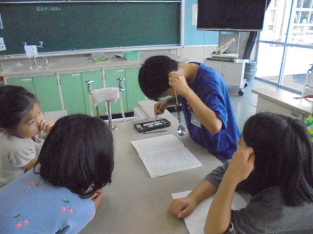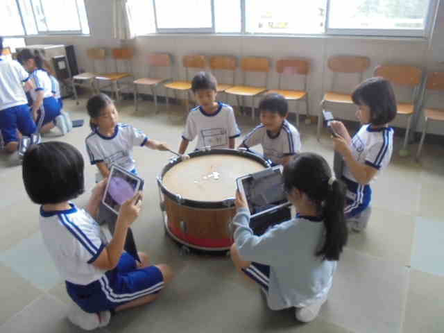 3年生は,理科で「音を調べよう」の学習をしています。たいこやトライアングル,スプーン,鉄棒などをたたいて音が出ているときの様子を調べました。たいこでは,音が出ているときに表面が震えていることに気が付きました。そして,音が大きくなるとその揺れも大きくなることに気付きました。また,音はひもや鉄を通して伝わっていることにも気が付きました。