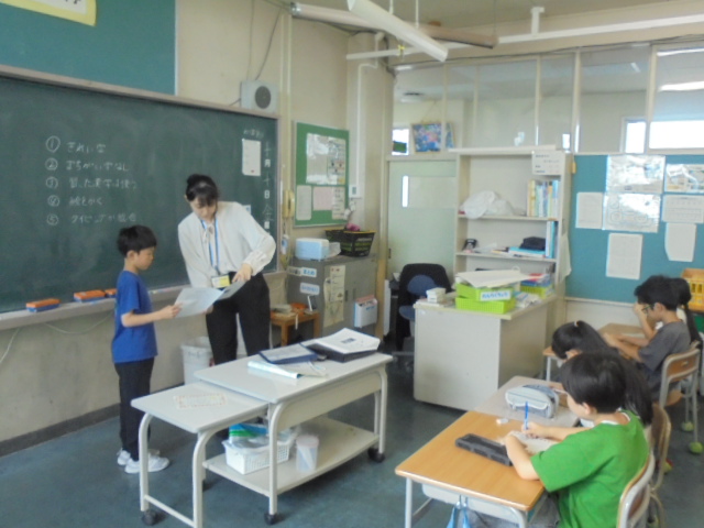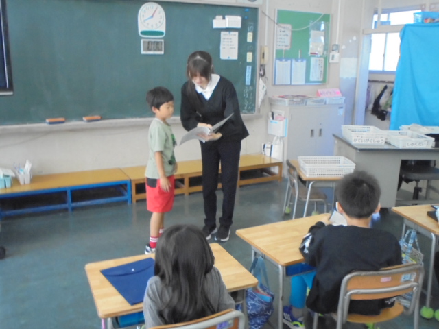| 本日10日(金)で,前期105日の教育活動が終わりました。節目の会【後期終業式・前期始業式】では,校長から次のような話(概略)がありました。 「朝日作文コンクール」で受賞した1年生の書いた「努力の壺」の作文を紹介します。(朗読) 今日は,前期終業式なので担任の先生から通知表を受け取ると思います。その通知表を見て,自分の「努力の壺」を見つけ,壺をさらに満たしていってください。 その後,各学級では担任から通知表が渡されました。1年生にとっては,小学校での初めての通知表を担任から受け取りました。担任が一人一人にがんばったところを話して通知表を渡すと,子どもたちはにっこり笑って,「ありがとうございます。」と言って受け取っていました。 |