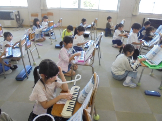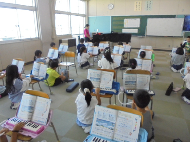 後期の学習が始まりました。2年生は,音楽で「ドレミであそぼう」の学習をしています。この日は,「ぷっかり くじら」の曲を歌ったり鍵盤ハーモニカで演奏したりしました。歌では,大きな声で楽しそうに歌っていました。また,鍵盤ハーモニカでは,友達の音をよく聞いてきれいな音色で演奏していました。