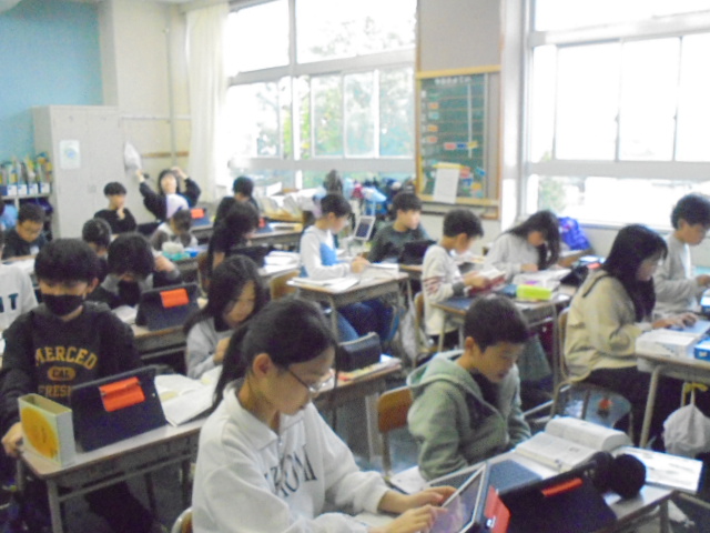 4年生は,国語で「くらしの中の和と洋」の学習をしています。範読を聞いて初発の感想を書いた後,意味の分からない言葉を国語辞典を使って調べました。「共存」「調和」など,子どもたちにとってはなじみのない言葉ですが,辞典で調べて意味を知ると,納得した様子でした。