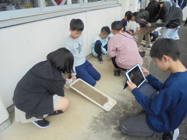 5年生は,理科で「流れる水のはたらき」の学習をしました。動画や写真で川の上流から下流までの川岸の様子や流れの速さ,石の形などを観察しました。その後,実際に山の作って水を流したり,水が入った容器の中でスポンジを振ったりして働きを調べました。子どもたちは,実験を通して流れる水の働きである「浸食」「運搬」「堆積」の理解を深めました。