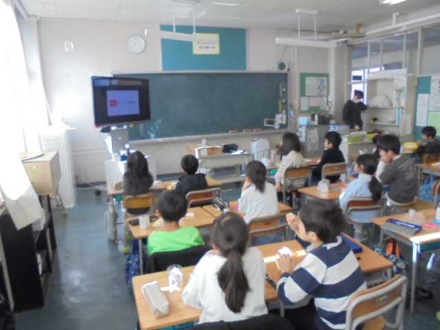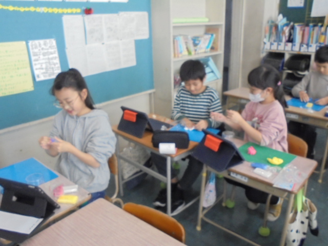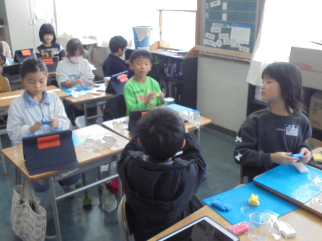 3年生は,図工で「空き容器の変身」の学習を始めました。この学習は,空き容器に紙粘土をつけて作品を作る学習です。最初に,色の付いた紙粘土を混ぜるとどんな色になるか動画を見た後,iPadに描いた作品を実際に作り始めました。子どもたちは,紙粘土を混ぜると色が変わったり,容器に紙粘土をくっつけたりして,楽しみながら作っていました。