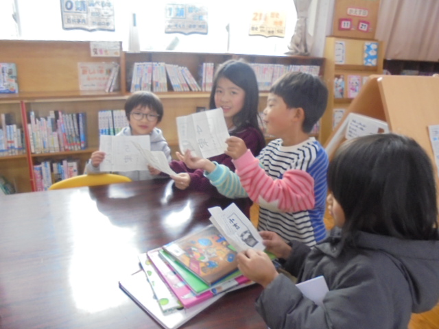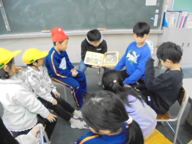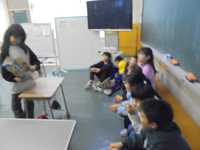 また,縦割り読書では,ひまわり班(異学年縦割り班)で6年生がおすすめの本の読み聞かせしました。読む速さや強弱など工夫した読み方をしていて,下学年も読み聞かせに吸い込まれていました。