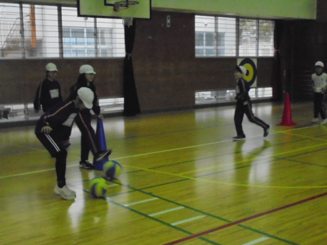 4年生は,体育で「サッカー」の学習をしています。準備運動の後,ダンスで体ほぐしをし,パスやドリブルの練習をしました。練習するごとに,パスやドリブルが上達しています。今後は,チームに分かれてゲームを行います。