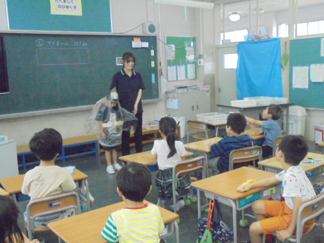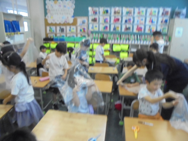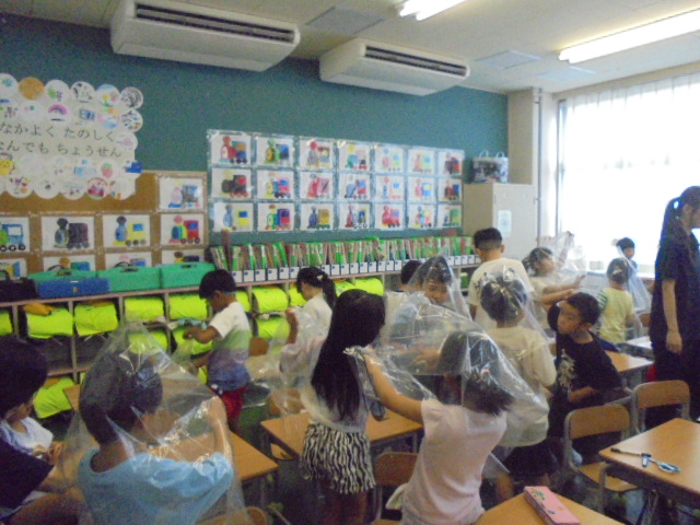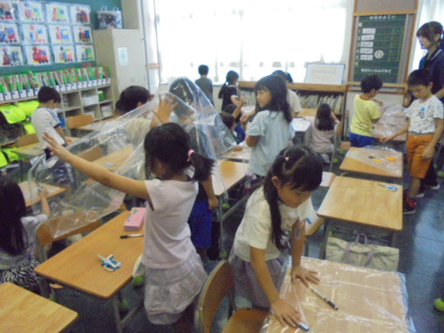 1年生は,防災教育の一環で,ビニール袋で防災がっぱを作っています。はじめに,できあがりのかっぱを見てイメージをふくらませ,説明を聞きながら作っています。ビニール袋に印をつけたり,はさみで切ったり,実際にかぶってみたりしながら作っています。できあがりを楽しみにしていてください。