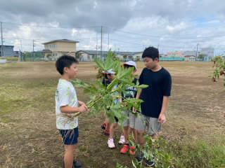 スマイル学級では,これまで育ててきた夏野菜を抜き,畑じまいを行いました。最後の野菜を収穫し,根っこから引き抜きました。周りの雑草も長く伸びて根っこも張っていたので,「おおきなかぶ」のようにつながって協力しながら抜きました。今度は,畑に大根を植え,冬に収穫をします。
