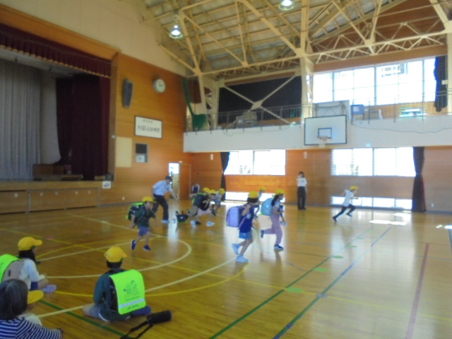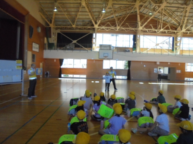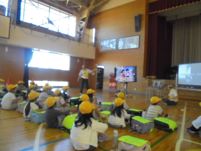 1年生が,市民生活課の方を講師に招き,子どもの体験型安全教室を行いました。紙芝居や実際に体験する活動を通して,自分を守る4つのアイテム「ノーランドセル」「じぶんのふうせん」「くちのブザー」「ぼうはんブザー」を学びました。子どもたちは,この体験教室を通して連れ去りに遭わないための方法を知りました。