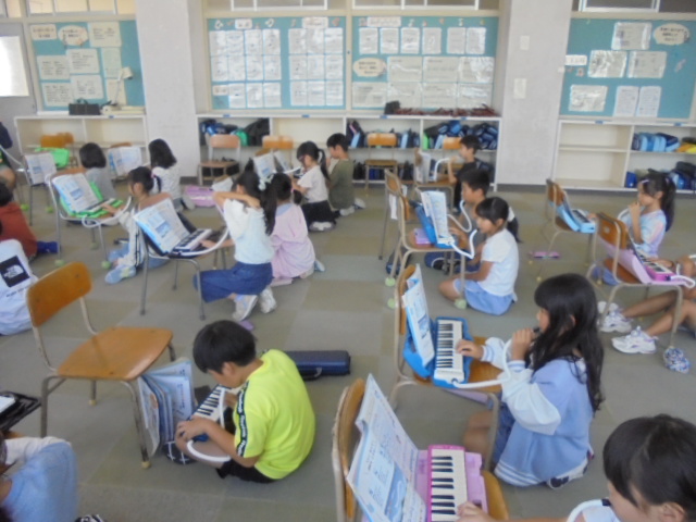 後期の学習が始まりました。2年生は,音楽で「ドレミであそぼう」の学習をしています。この日は,「ぷっかり くじら」の曲を歌ったり鍵盤ハーモニカで演奏したりしました。歌では,大きな声で楽しそうに歌っていました。また,鍵盤ハーモニカでは,友達の音をよく聞いてきれいな音色で演奏していました。