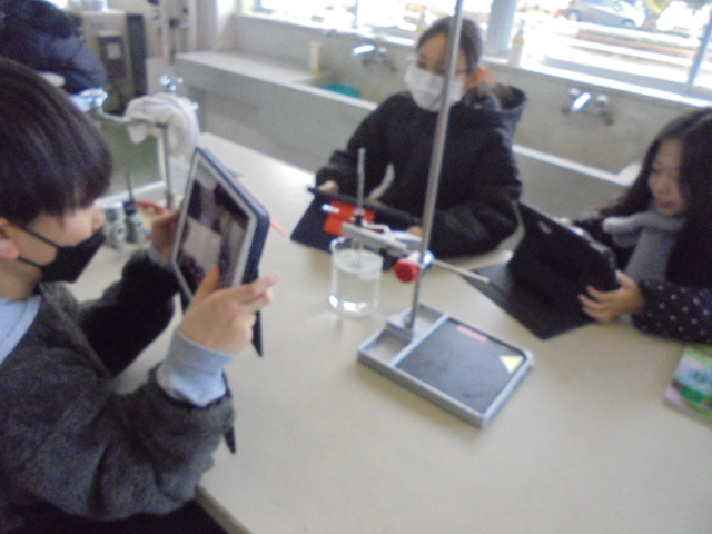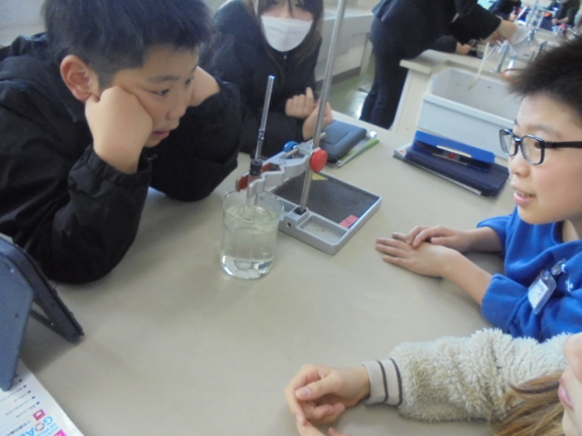 4年生は,理科で「ものの体積と温度」の学習をしています。前時に,空気は温めると体積が増えることを学習し,この日は「水は,温めると体積はどうなるのだろうか」という学習課題に取り組みました。水は変わらないという予想で実験に取り組みましたが,実験では試験管の中の水の体積が増えて,子どもたちは驚いていました。そして,冷やすと体積はどうなるのだろうかと新たな課題が生まれました。