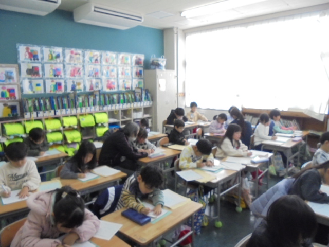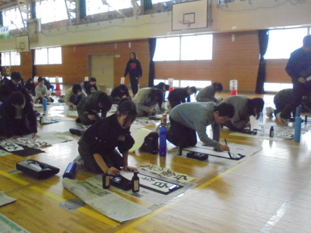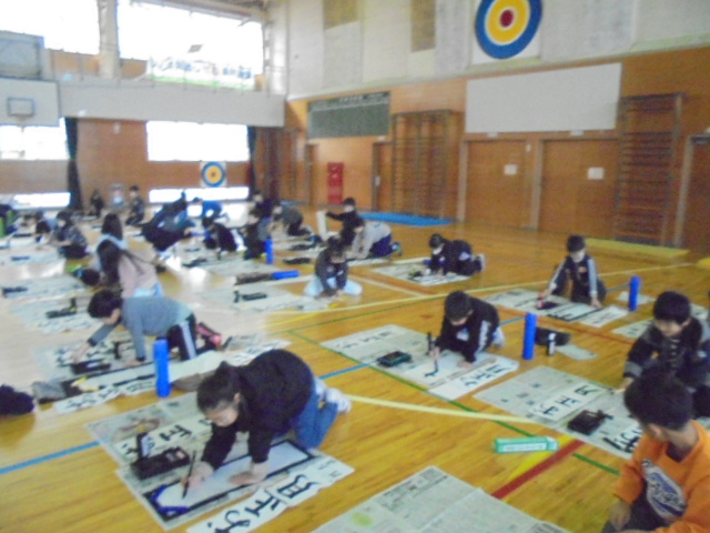 | 15日(木),校内書き初め大会(1・2年硬筆,3年以上毛筆)を行いました。3年生以上は,体育館で静まりかえった中,筆を走らせました。どの子も冬休みの練習の成果を発揮しようと,一筆一筆思いを込めて書きました。 1年 … 大きなこえであいさつします。 2年 … みんな元気で,お正月をむかえました。 3年 … お正月, 4年… 光る空 5年 … 富士山, 6年… 白銀の道 なお,1月19日(月)から1月30日(金)まで校内書き初め展として,各学年の教室廊下に展示しています。ぜひ,子どもたちの力作をご覧ください。 |