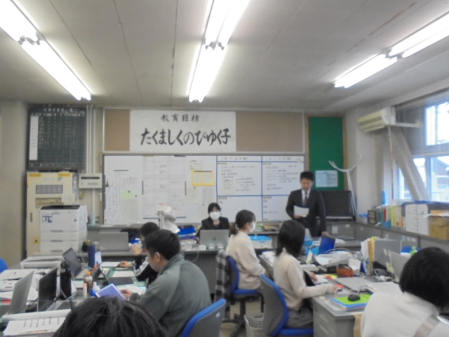 | 明けましておめでとうございます。今年も当校の教育活動にご理解とご協力をよろしくお願いいたします。 さて,7日(水)は,冬季休業最終日でした。年始に降った雪が前庭やグラウンドに残っています。本日は,明日から始まる教育活動に向けて打ち合わせや準備をしたりしました。 会議では,校長から次のような念頭のあいさつ(概略)がありました。 教師という仕事は,素晴らしい仕事です。できる限り自分の力を発揮して,「仕事ができる」=「教育ができる」環境をつくっていきましょう。健康に留意して,一歩一歩進んでいきましょう。 全職員,明日子どもたちが元気に登校してくることを楽しみに待っています。明日の朝も降雪が予想されますので,交通安全には十分気を付けて登校させてください。 |