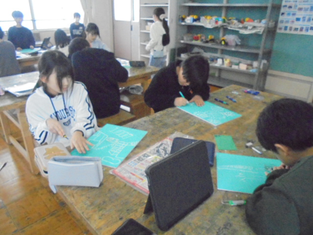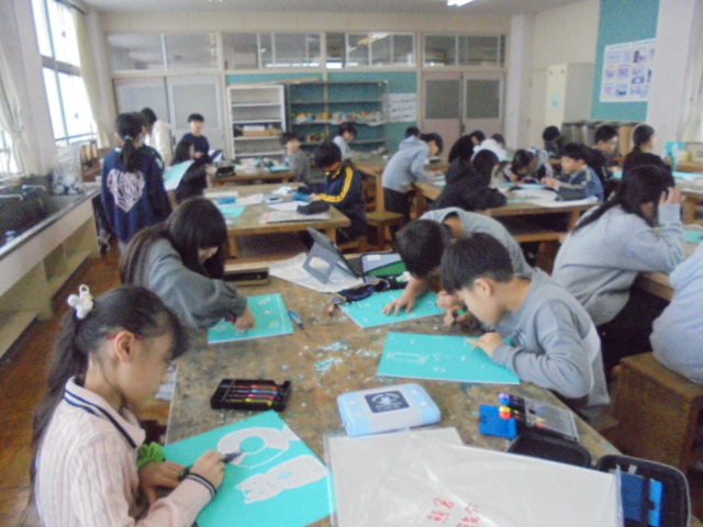 4年生は,図画工作で「ほって すって(木版画)」の学習をしています。形から自分が版画に表したいものをイメージして,今は彫刻刀で彫っています。彫刻刀を使うのは初めてですが,安全に気を付けて彫り進めています。もうすぐ彫り終わるので,今度はインクを付けて刷ります。どんな作品ができるか今から楽しみです。
