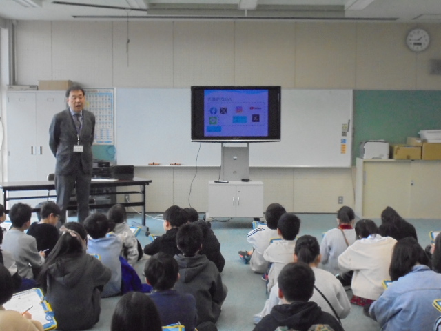 間もなく始まる春休みを前に,5・6年生が学校支援課指導主事を講師に,「ネットトラブルを防ぐための授業」を行いました。授業では,SNSの特徴やネット上の書き込みや投稿が思わぬトラブルに発展することなどを説明していただきました。子どもたちは,便利で楽しいSNSだけど,一歩間違えるとトラブルに発展してしまう危険性があることを理解しました。