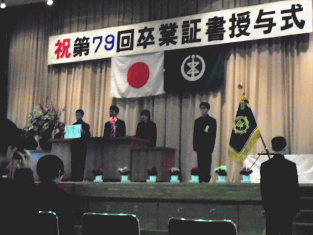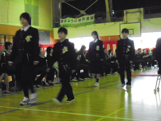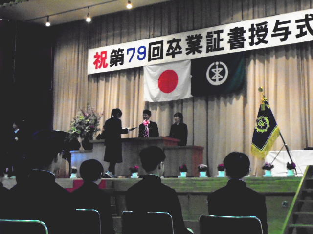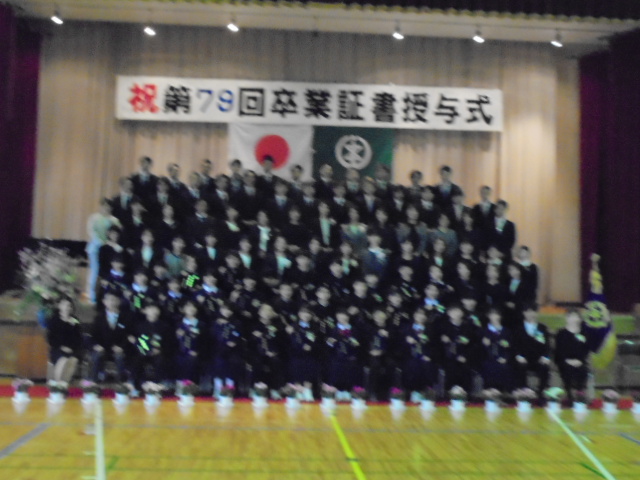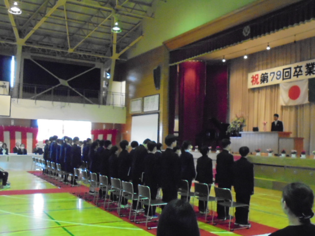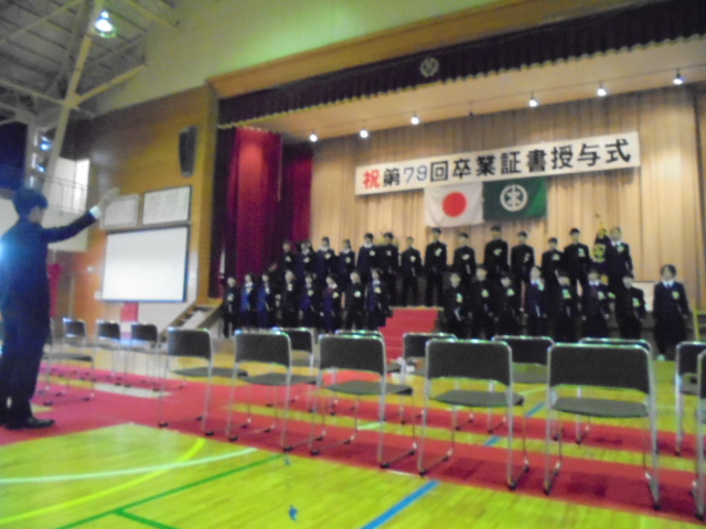 19日(木),第79回卒業証書授与式を行いました。中学校の制服を着て少し緊張して入場した卒業生でしたが,証書授与では凜とした姿で校長から卒業証書を受け取りました。