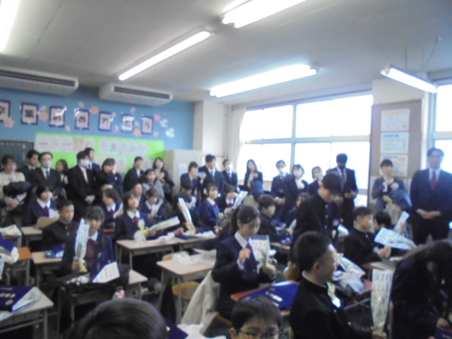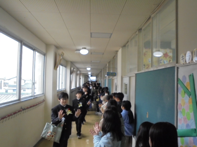 また,全校児童による呼びかけや式歌「ひまわりの風」では,6年間の小学校生活を振り返っていました。式後の教室や記念撮影では,緊張感から解き放たれ卒業の喜びを感じながら友達や家族と楽しく話したり写真を撮ったりする姿が見られました。